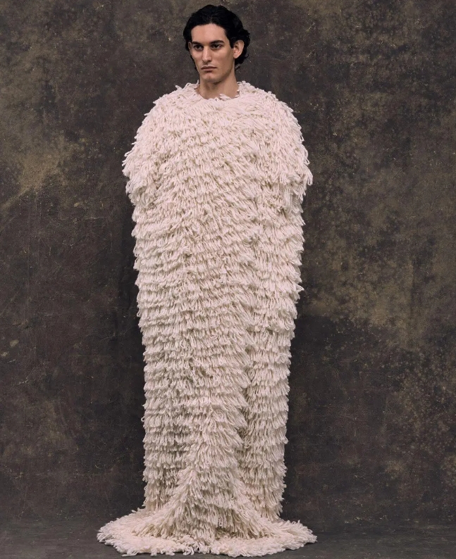 Each piece is meticulously handmade using precious materials such as cashmere and wool, celebrating the innate hues of fiber with minimal adornment that bridges heritage and innovation—simple yet striking. A cashmere gauze layered over felted outerwear replicates the subtle interplay of light and shadow in Renaissance sculpture; a fine wool-blend handmade coat embodies masterful artistry; two oversized knitwear pieces distinguish themselves through cloud-like softness or dynamic fringes, uniting aesthetics and function; three shepherd cloaks, acclaimed as the “soul of the exhibition,” articulate a cross-cultural narrative of craftsmanship through contrasting textures that juxtapose rugged naturalness with refined delicacy; two monumental 2.5-meter tapestries astonish—one evoking a galaxy of fringes, the other redefining wall art, dissolving boundaries between clothing and devices; a wash-felted cashmere kimono-style coat embodies resilience within softness. Consinee creatively unleashes the full potential of fibers on the stage of PITTI UOMO.